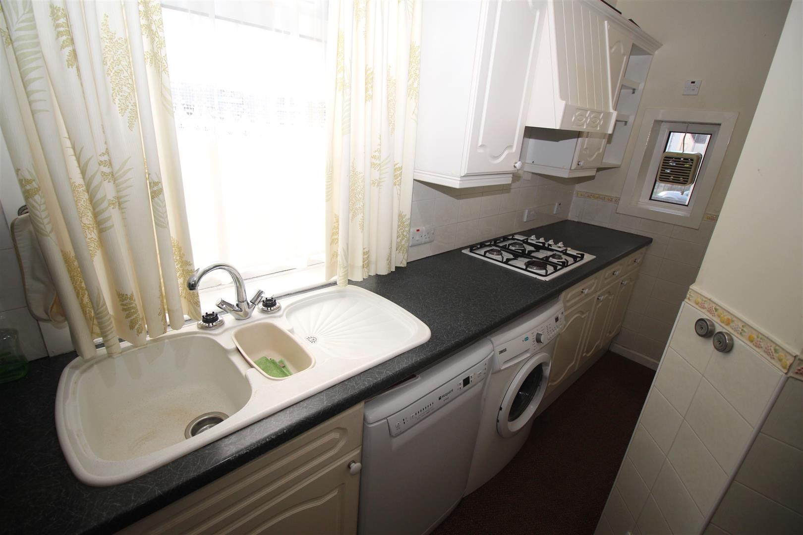 There is an “L” shaped Kitchen with windows to the front and side plus white fitted units, green toned marble style work surfaces and splashback tiling. Appliances include: canopy extractor hood, gas hob, fridge, washing machine and dishwasher.