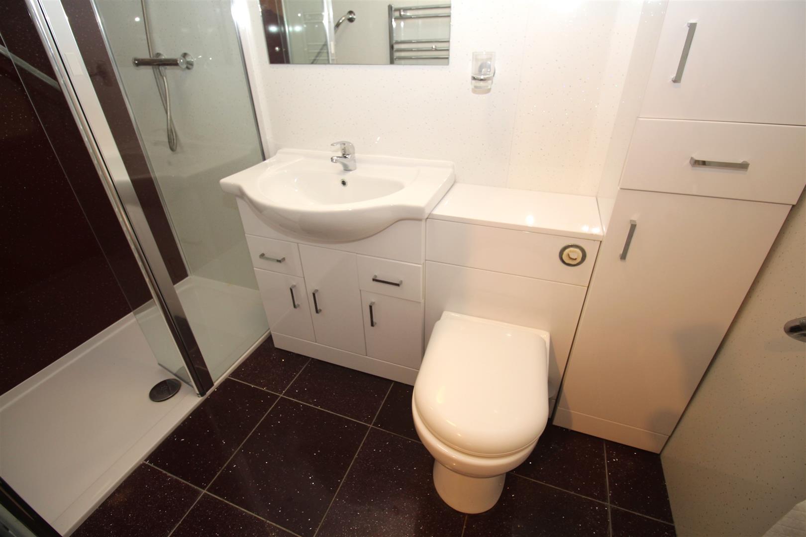 There is a front facing double sized Bedroom and 2nd single Bedroom with side window. The Shower Room has a three piece suite comprising: vanity wash hand basin, wc and double sized cubicle with chrome style shower. Additional features include: wet wall panelling, decorative panelled ceiling, tiled floor and chrome style heated towel rail.