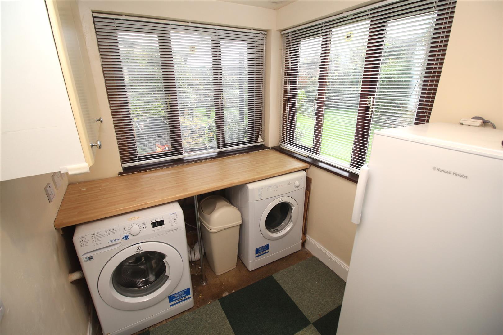 The rear facing Dining Kitchen features a range of white fitted units, beech style work surfaces and splashback tiling. Appliances include: extractor hood, gas hob, electric oven, dishwasher and fridge. There is ample space for a dining table and chairs within this room which also features a fireplace and inbuilt cupboard. There is access to the Utility Room with side and rear windows, plus UPVC double glazed door leads to the rear garden. The utility room benefits from beech style fitted units.