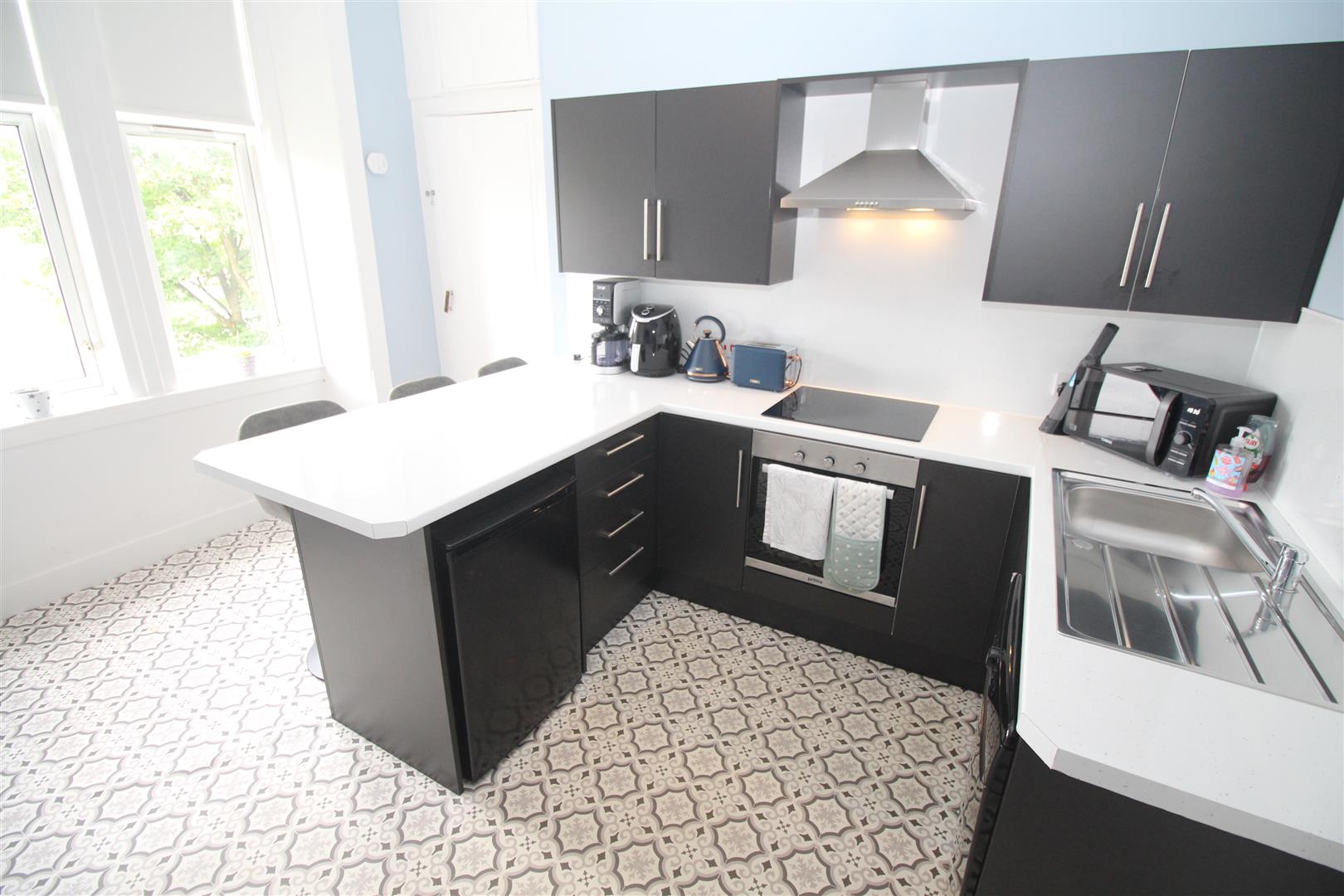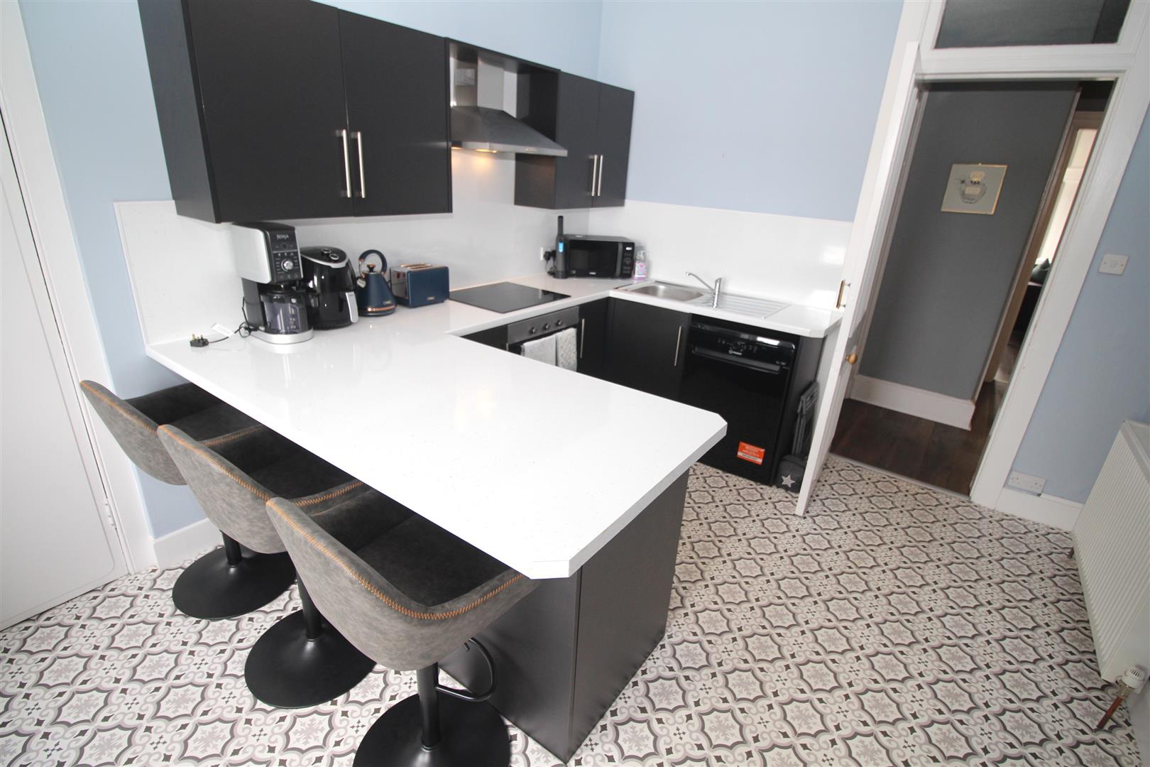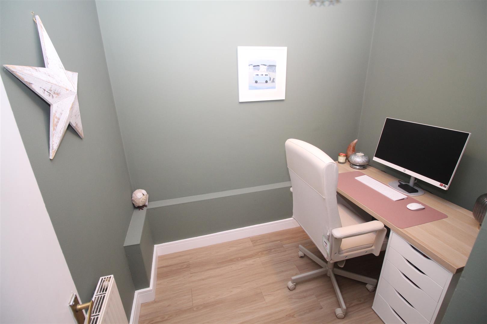 There is a quality refitted Breakfasting Kitchen with black units, high gloss marble style work surfaces and matching splashback. Appliances include: stainless steel chimney extractor hood, electric ceramic hob and oven. There is a storage cupboard with rear window. The internal Home Office is an ideal space for home workers.