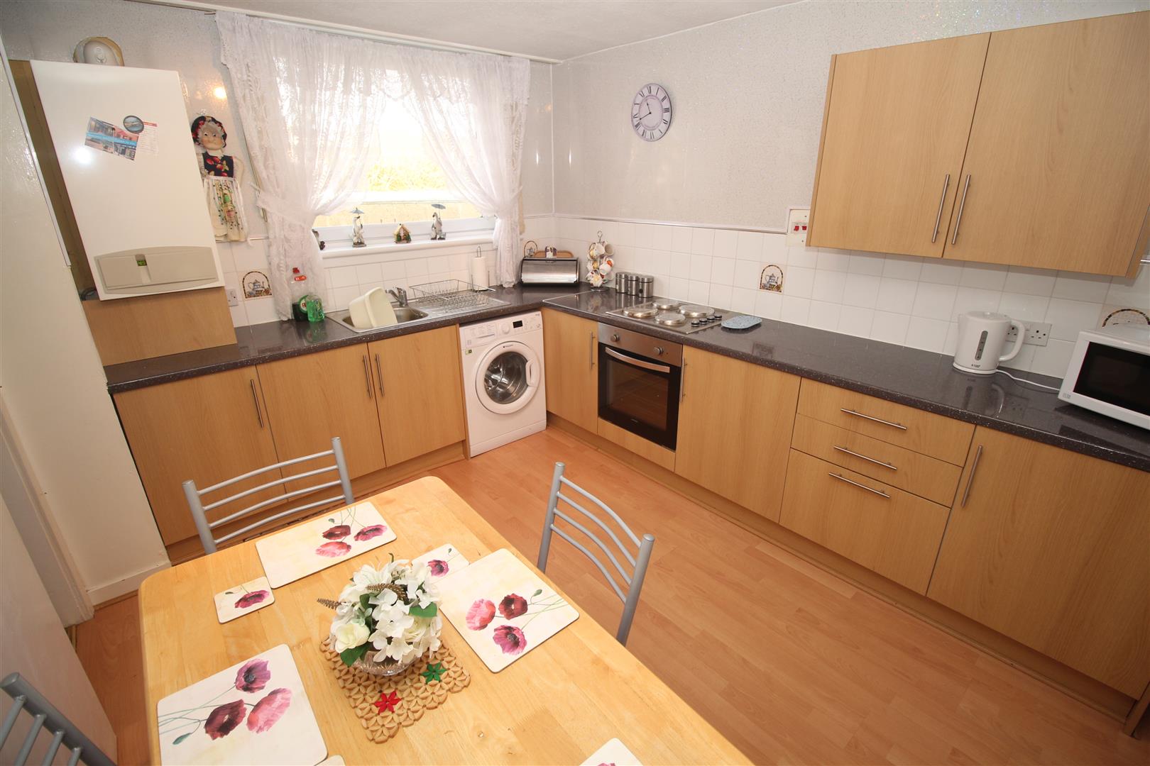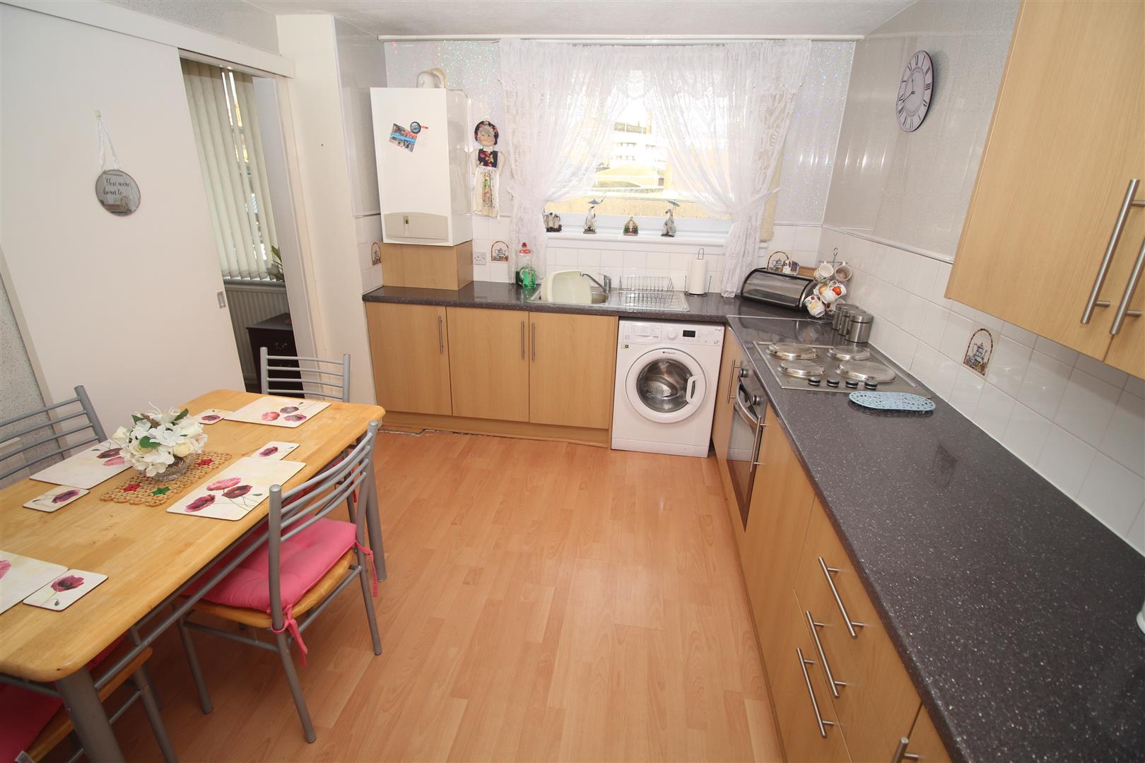 Accommodation comprises: Entrance Hallway by timber door with two single and one double inbuilt storage cupboards. The front facing Lounge is a bright apartment with two double storage cupboards and two front facing windows. The fitted Dining Kitchen can be accessed from either the hall or the lounge. There are light oak style fitted units and high gloss pearlescent work surface areas. Appliances include: electric hob, oven, washing machine and fridge/freezer. There is ample space for a dining table and chairs.