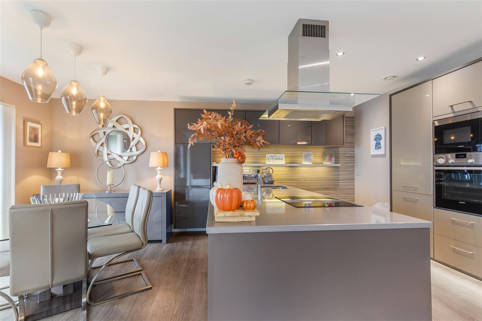 The designer luxury Kitchen features range of high gloss dark grey units and solid granite work surfaces. Specification includes: “Siemens” integrated appliances including: stainless steel chimney extractor hood, induction hob, electric oven, integrated microwave, fridge/freezer & dishwasher. The airy Dining Area features a front window and additional door giving access to the balcony.