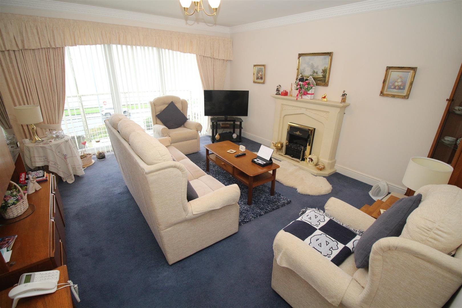 Accommodation comprises: Entrance Hall by timber door with inbuilt cupboard. There is an airy front facing Lounge featuring a door / window formation allowing direct access to the balcony plus there is an ornate fireplace with electric fire. The rear facing Dining Kitchen features a range of white grained style fitted units with blue toned work surfaces and splashback tiling. Appliances include: extractor hood, electric hob, oven, washing machine, integrated fridge/freezer, dishwasher and microwave. There is space for a table and chairs within this room.