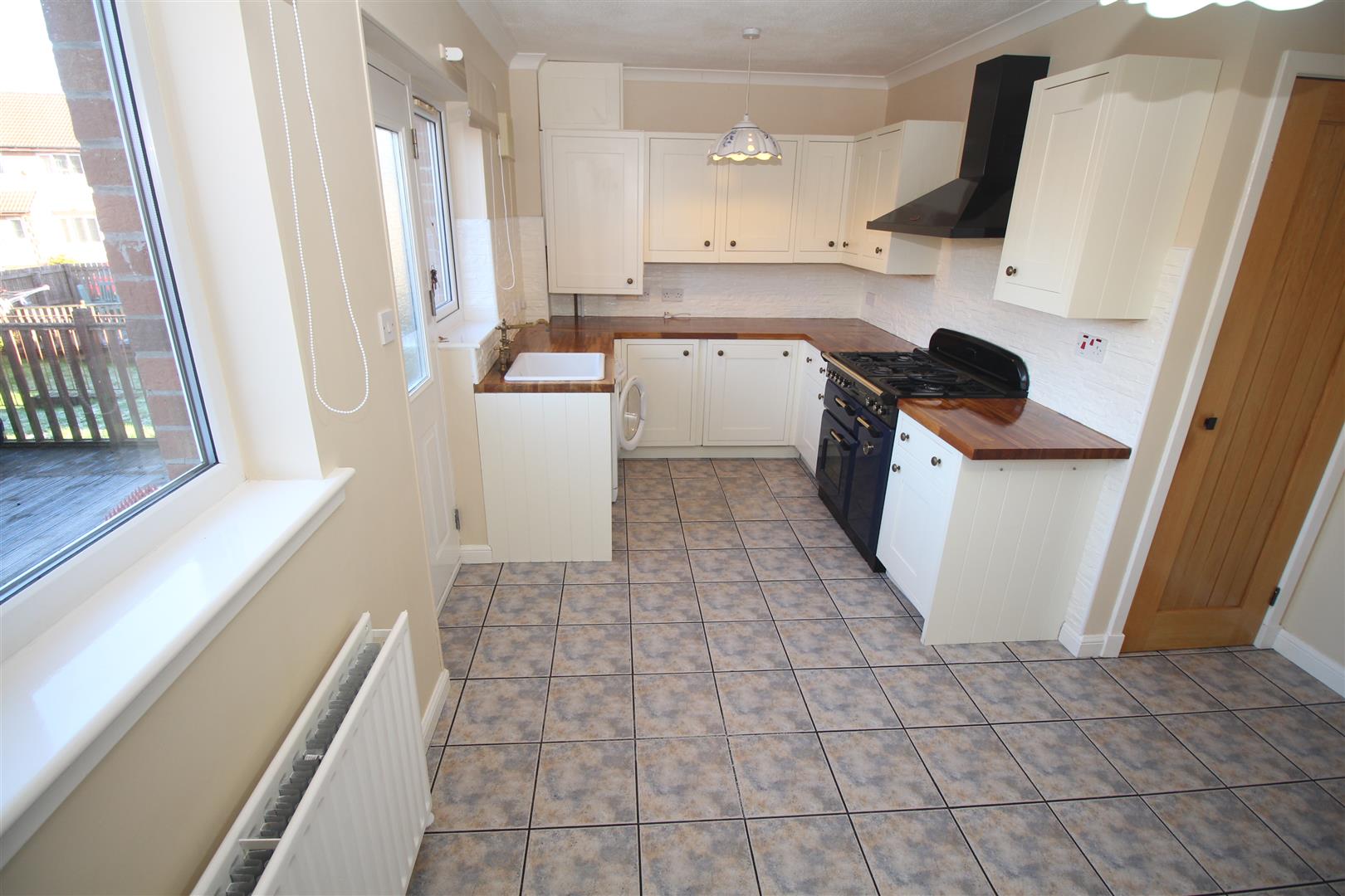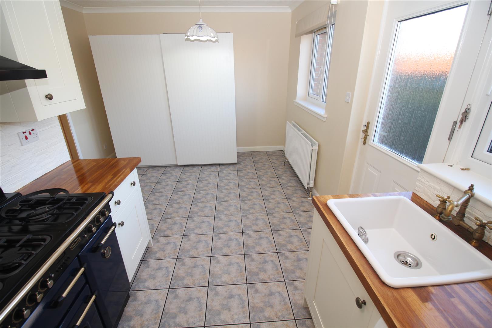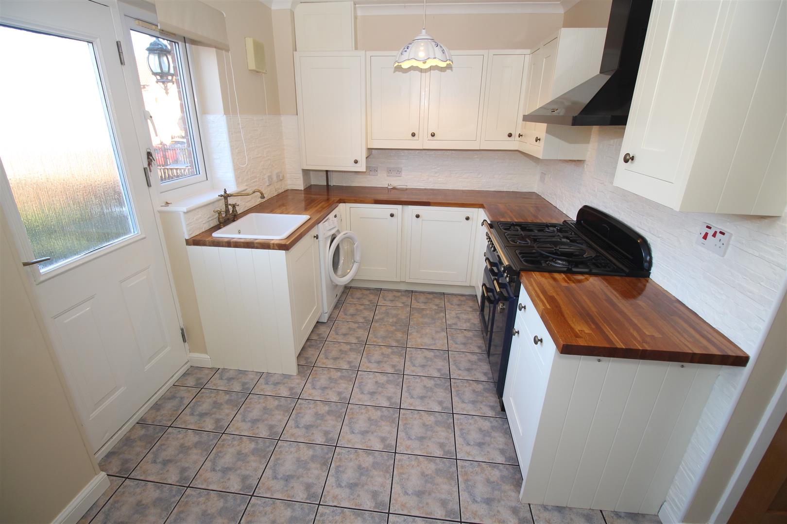 The bright and stylish interior comprises: Entrance Hall by UPVC double glazed door with side panel. There is an airy front facing Lounge with inbuilt storage cupboard. The Dining Kitchen overlooks the rear garden and offers a range of soft cream units, solid beech work surfaces and splashback tiling. Appliances include: chimney extractor hood, range cooker, washing machine and integrated dishwasher. There is a useful walk in cupboard.