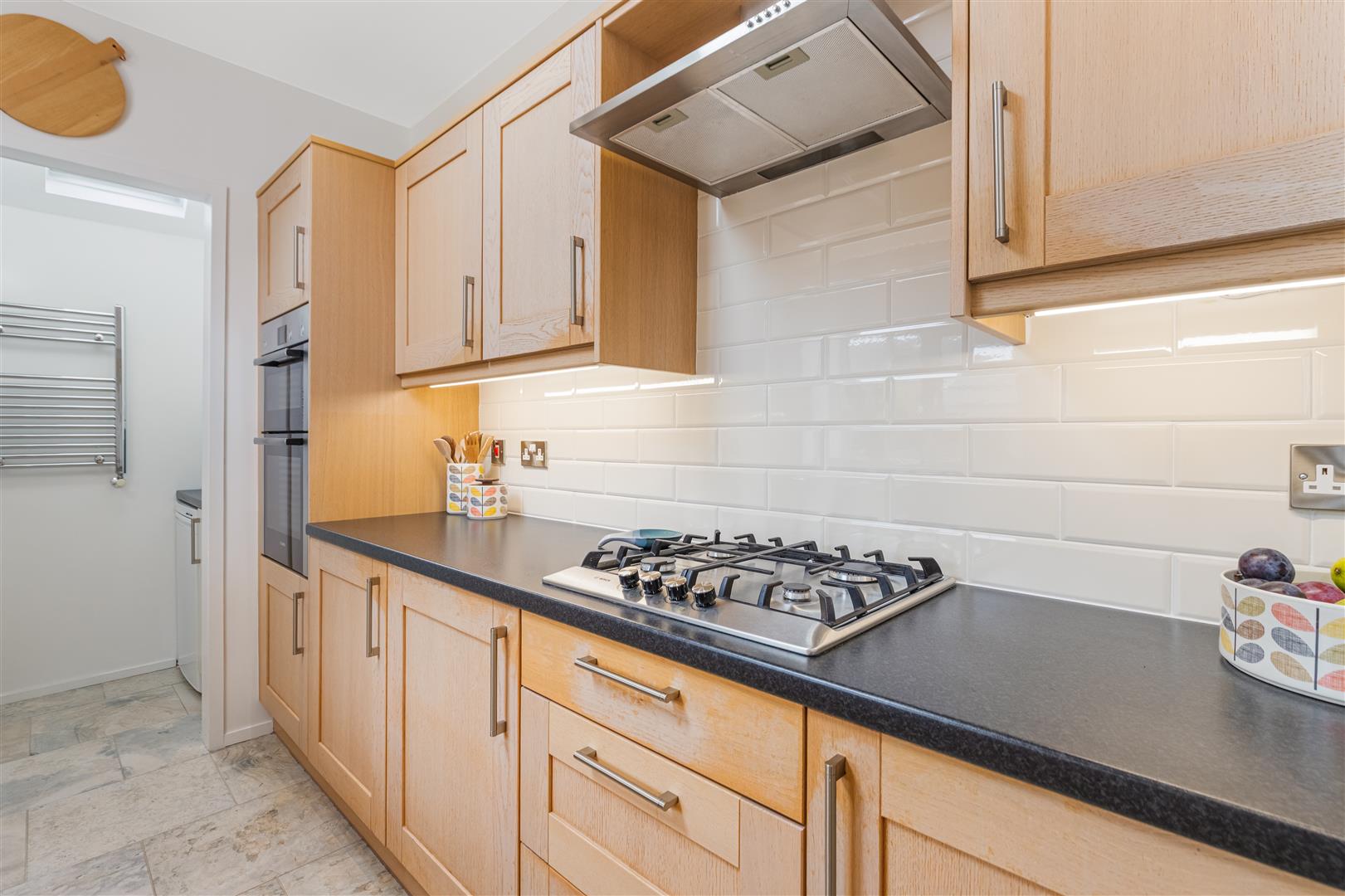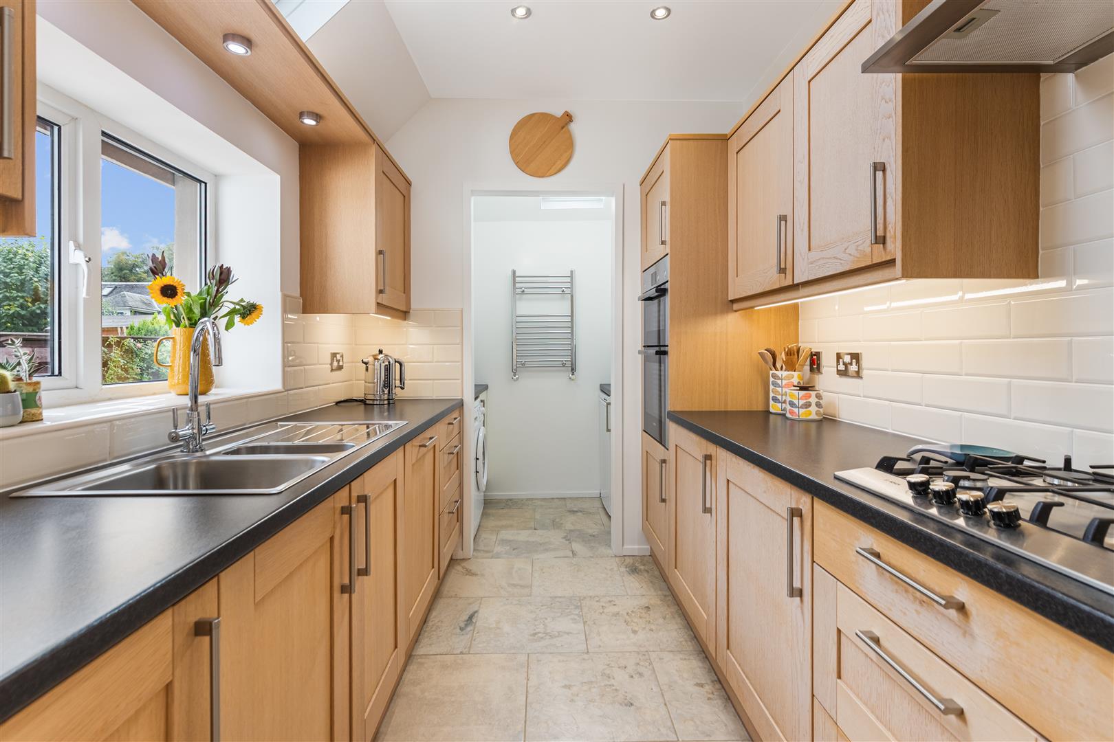 A luxury refitted Kitchen offers light oak style units, black granite effect work surfaces and splashback tiling. Appliances include: stainless steel chimney extractor hood, gas hob, electric oven, integrated fridge, freezer and dishwasher. A Utility Room includes washing machine and freezer. There is a downstairs double Bedroom with inbuilt wardrobe.