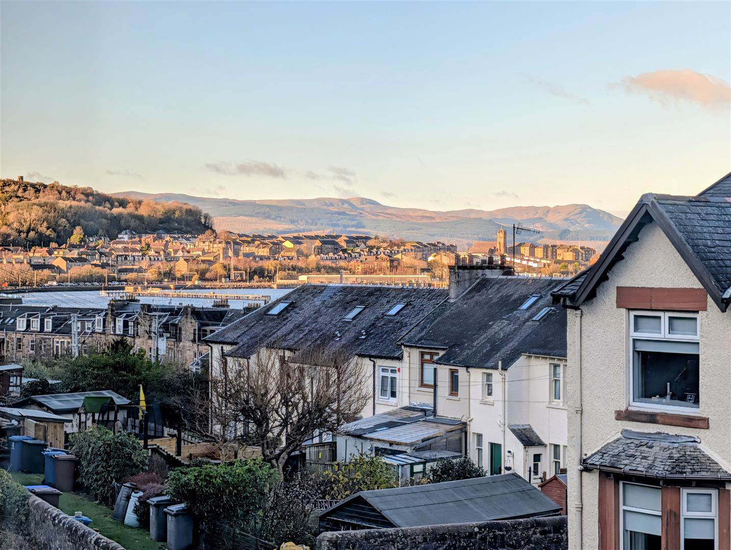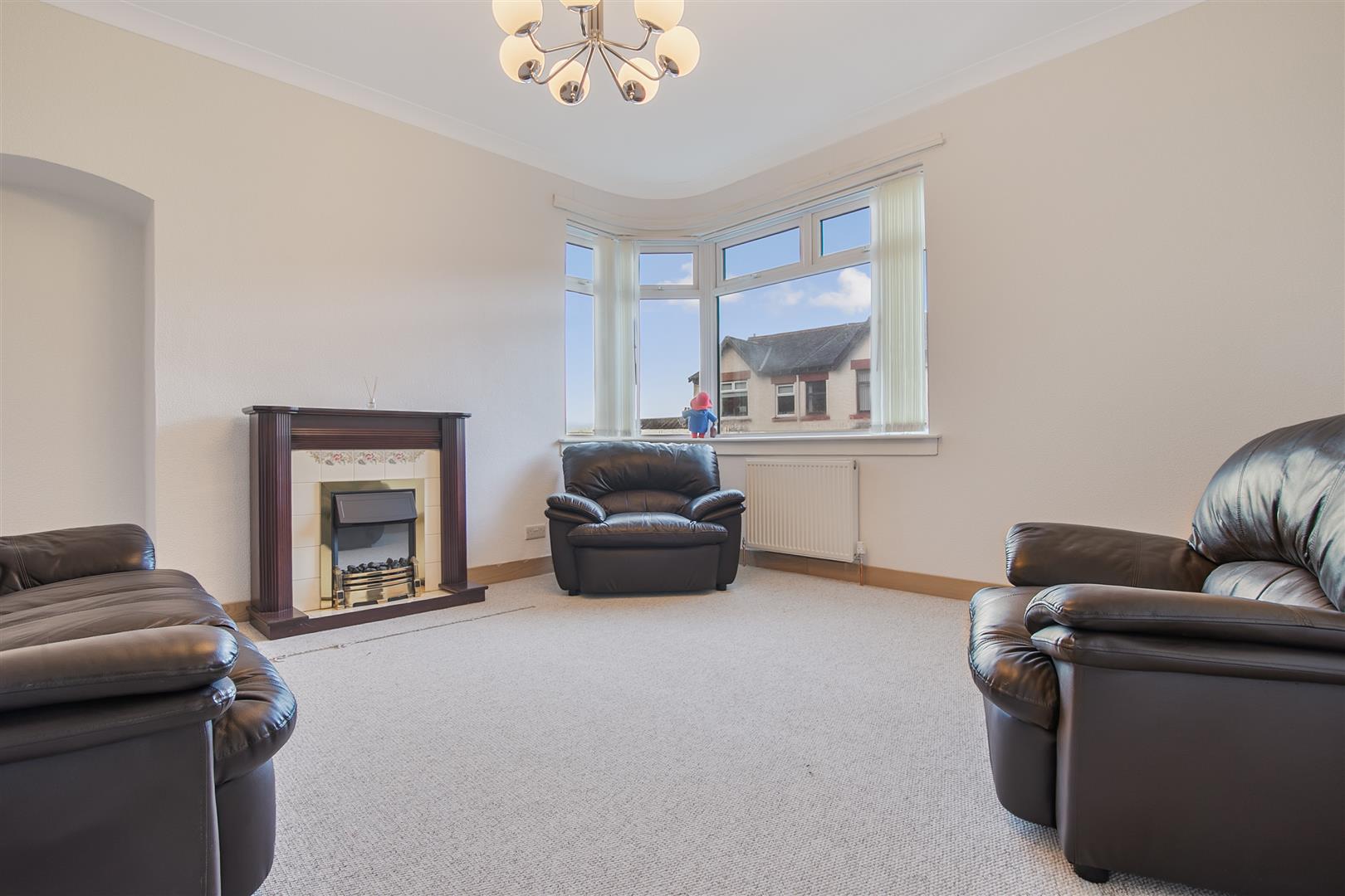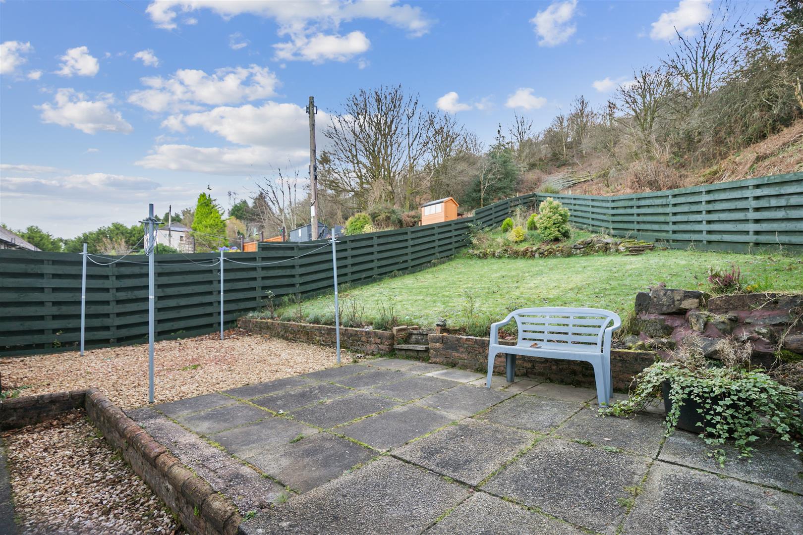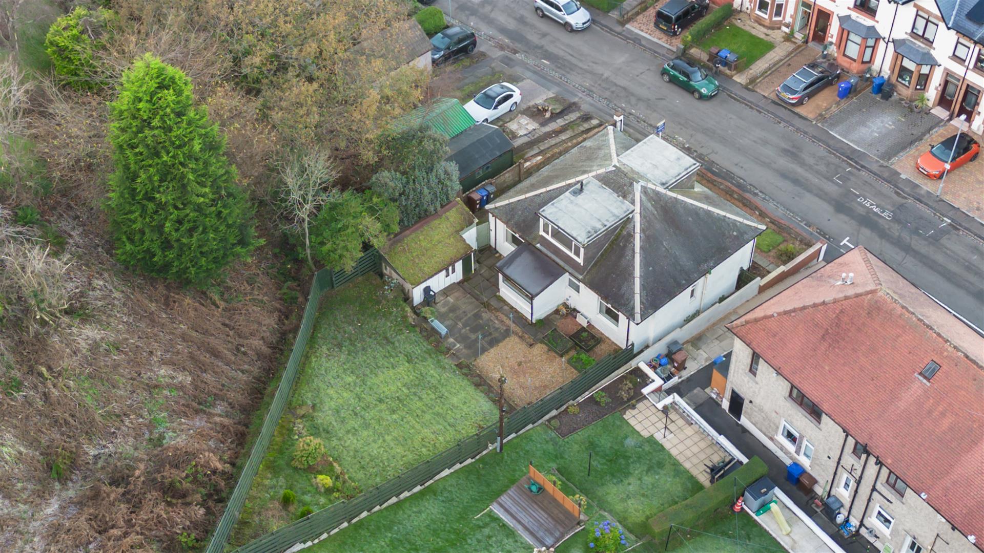 Driveway offers parking for several cars leading to the detached garage with side courtesy door, light and power installed. There is an enclosed lawned front garden. The south facing rear garden backs onto Lyle Hill and features paved patio, lawn and pebbled area. This is a perfect space for relaxing on summer days. Conveniently located for Fort Matilda railway station with frequent service to Glasgow which is ideal for commuters and the Battery Park is just a short walk away.