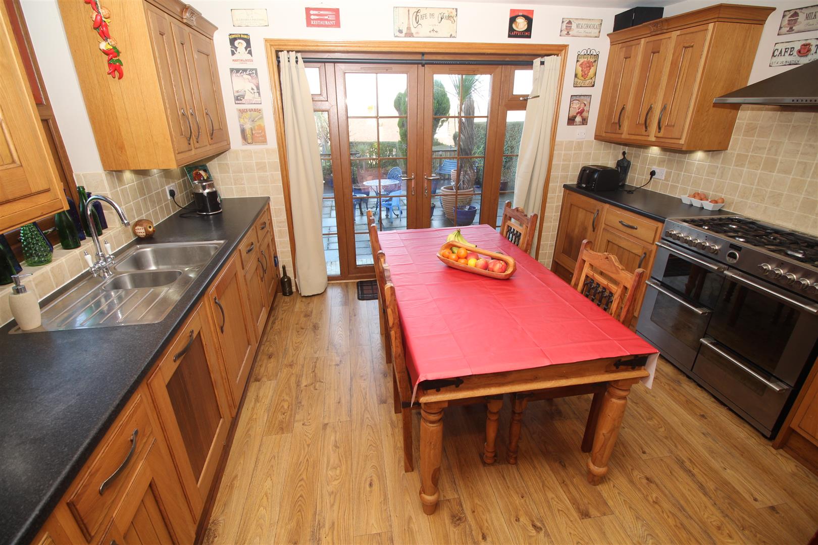 Stairs lead down to the Lower Landing with access to the basement cellar which is where the boiler is located and there is plumbing for a washing machine. The Dining Kitchen with windows to the side and rear plus French doors to the garden. There are oak style fitted units, black/marble style work surfaces and splashback tiling. Appliances include: stainless steel chimney extractor hood, range cooker, intgrated dishwasher, fridge and freezer.