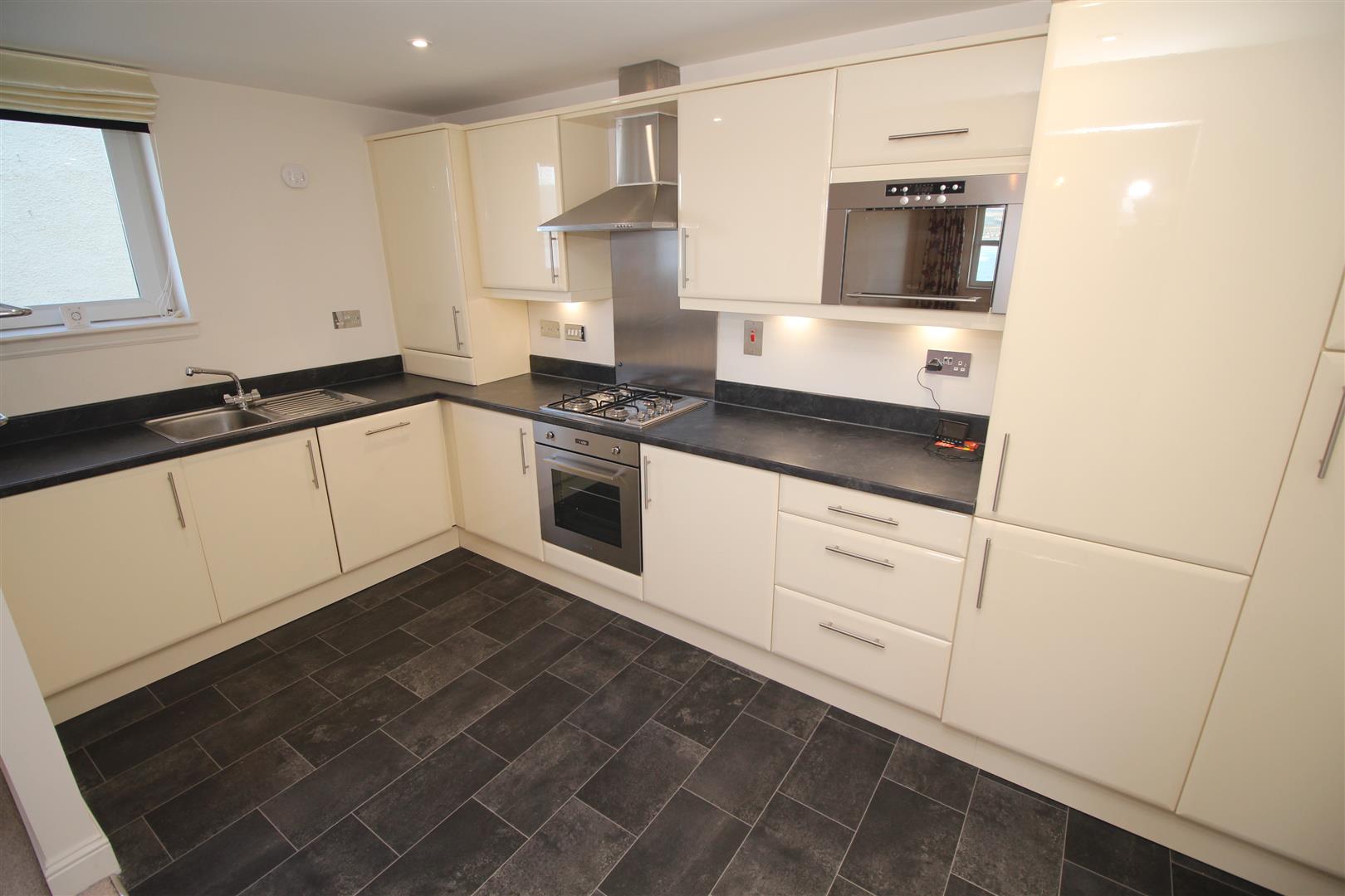Impressive accommodation comprises: Hallway by timber door with inbuilt cupboard. The generous sized Lounge features two rear facing windows and archway leading to the open plan quality fitted Kitchen. The kitchen with side window features soft cream style high gloss units and black/grey marble effect work surfaces. Appliances include: stainless steel chimney extractor hood, gas hob, electric oven, integrated fridge/freezer, dishwasher, washer/dryer and microwave.