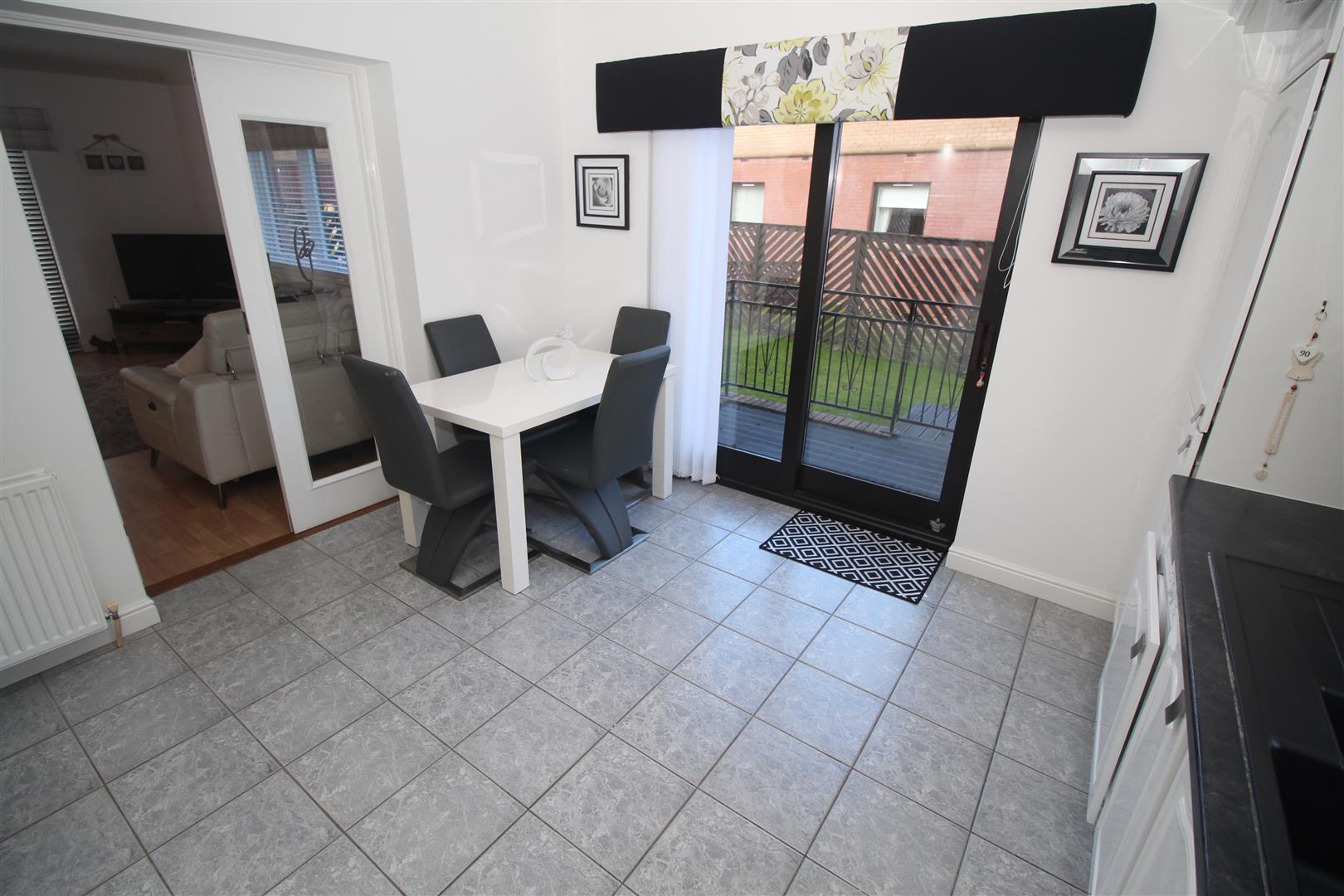 Highly impressive accommodation comprises: “L” shaped Entrance Hallway by timber door with inbuilt storage cupboard. There is an airy Lounge with windows to front and side, plus patio doors leading to the patio. Glazed double doors lead the Dining Kitchen features patio doors to side deck and a rear window. The kitchen can be accessed from the hall or lounge. There is a range of white high gloss fitted units, black toned marble style work surfaces and splashback tiling. Appliances include: extractor hood, gas hob, electric oven, integrated fridge/freezer, microwave, dishwasher and microwave. There is a ample space for table and chairs within this room.