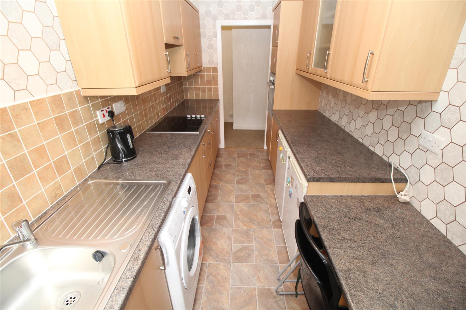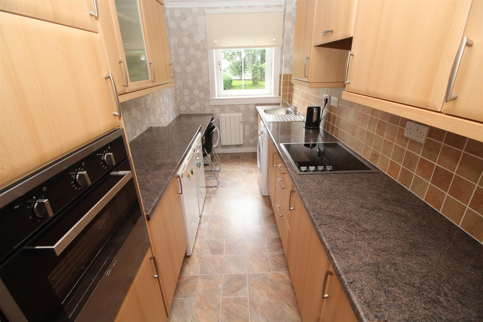 Quality fitted kitchen with beech-style units, granite-effect work surfaces and splashback tiling