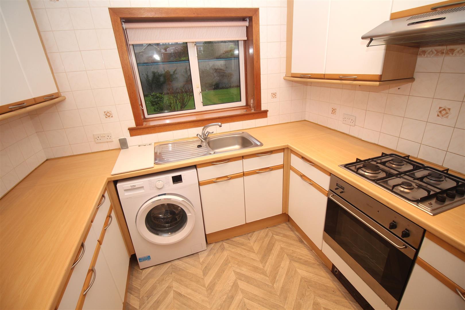 The Kitchen features white fitted units with beech style edging, work surfaces and splashback tiling. Appliances include: stainless steel extractor hood, gas hob, electric double oven, washing machine and fridge/freezer.